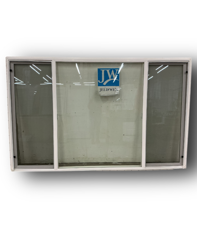 In good condition. Jeld-Wen Vinyl 3-Panel Slider. XOX Vent/Fixed/Vent with screens included. White vinyl frame. Low-E double glazing with argon gas insulation. Dimensions: 95.5"W x 59.5"H.