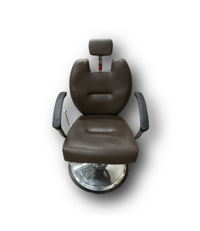 Used in good condition. Vintage Brown Professional Salon & Barber Chair. Brown barber chair with a chrome hydraulic base. Features a reclining back and adjustable headrest for comfort. Sturdy, stylish, and easy to clean. Dimensions: 25" W x 22" D.