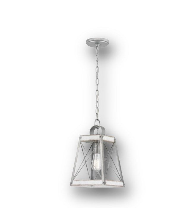 Good condition in box. Like new. Progress Lighting Bradberry 1-Light Pendant. Small farmhouse square pendant in antique white with galvanized accents and seeded glass. Uses one 60-watt E26 bulb (not included). Dimensions: 8" W x 8" D x 9" H.