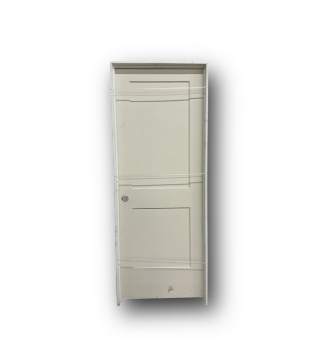 Good condition. Like new. 30-in x 80-in 2-Panel Interior Door. Right-hand swing. Solid-core design. Primed and ready to paint. Features satin nickel hinges and a pre-assembled frame for easy setup. Single bore. Door: 30" x 80". RO: 31.25" x 82".