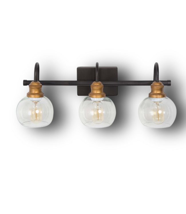 Good condition in box. LNC charm vintage collection. Brushed gold accents. Black finish color. Clear glass globe shade. Hardwired. Dimmable. Damp rated. Dimensions: 22.5"W x 7"D x 9"H. Universal mount up or down.