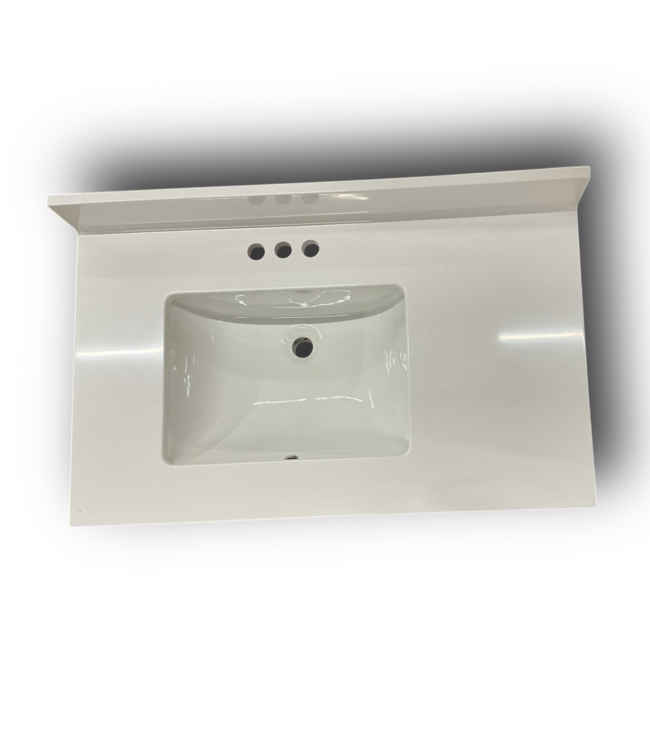 Good condition. Like new. White color. Semi gloss. Cultured marble. Undermount sink that is offset to the left. Integrated backsplash. 4-inch centerset, pre-drilled holes. Dimensions: 36"W x 22"D x 1"T.