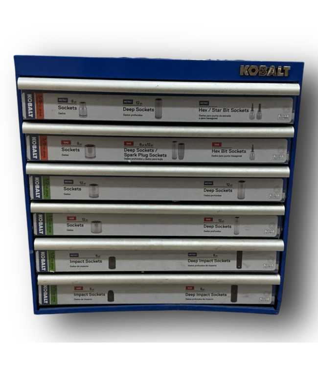 Used in good condition. Kobalt Blue 6 drawer Tool Chest. 6 drawers with integrated handles. Removable plastic tabs included. Has a few scratches. Dimensions: 23.25"W x 22"D x 23"H.