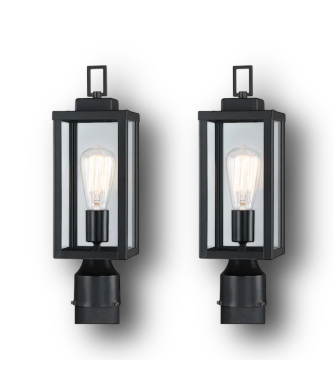 Good condition in box. Like new. Hukoro 16.5-in Matte Black Outdoor Lantern 2-Pack. Clear glass. Weather-resistant aluminum construction. Designed for outdoor pier or post mounting. Uses one 60-watt bulbs (Not included). Size: 7.09"W x 16.5"H x 7.09"D.