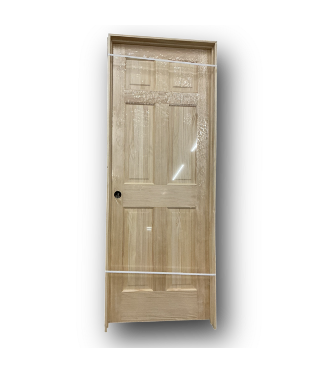 In good condition. Reliabilt Unfinished Solid Core 6-Panel Prehung Interior Door. Right Hand inswing. Pine wood. Can be cut to fit. Without frame: 29.75"W x 1.375"T x 80"H. With frame: 31.375"W x 4.5"T x 82.1875"H.