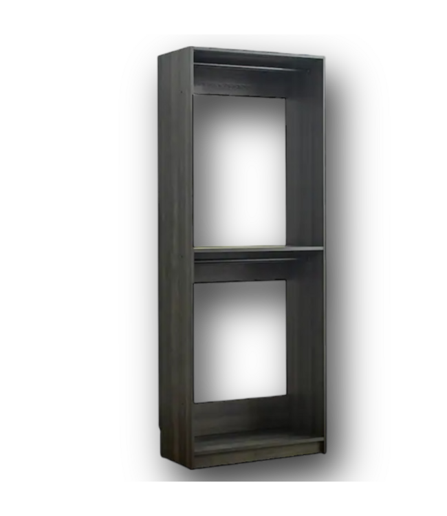 Good condition in box, ready to assemble. Klair Living Prosper 2-Rod Dark Gray Wood Closet System. Hardware included. Freestanding. 2 rods included. Walk in configuration. Modular design. Dimensions: 31.32"W x 15.7"D x 82.92"H.