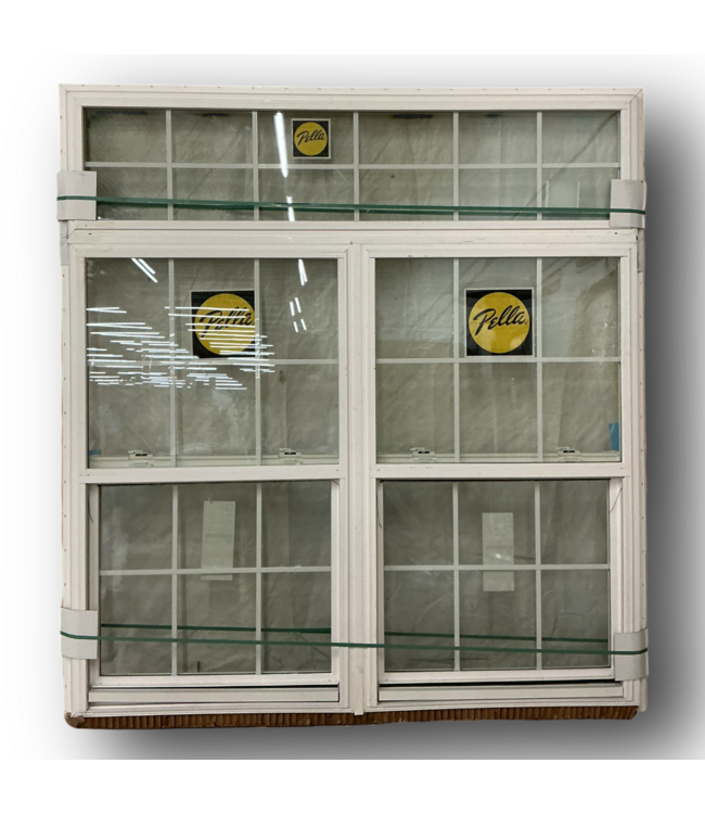In good condition. Pella White Vinyl 3 Panel Sliding/Fixed Window. 250 series. 2 single hung side by side with fixed top panel. Tempered. 36 total internal grids. Low-E 180/i89. High altitude with argon gas. Dimensions: 71.625"W x 77.5"H.