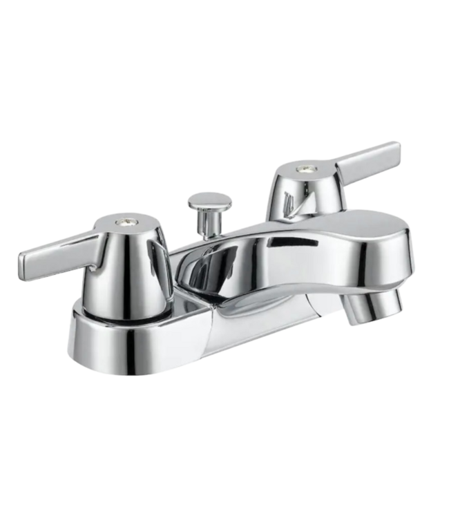 Good condition in box. Like new. Project Source Rutland Chrome Centerset Bath Faucet. Two handle. Low-arc. Residential. Pop-up drain included. Washerless cartridge. Polished chrome finish.