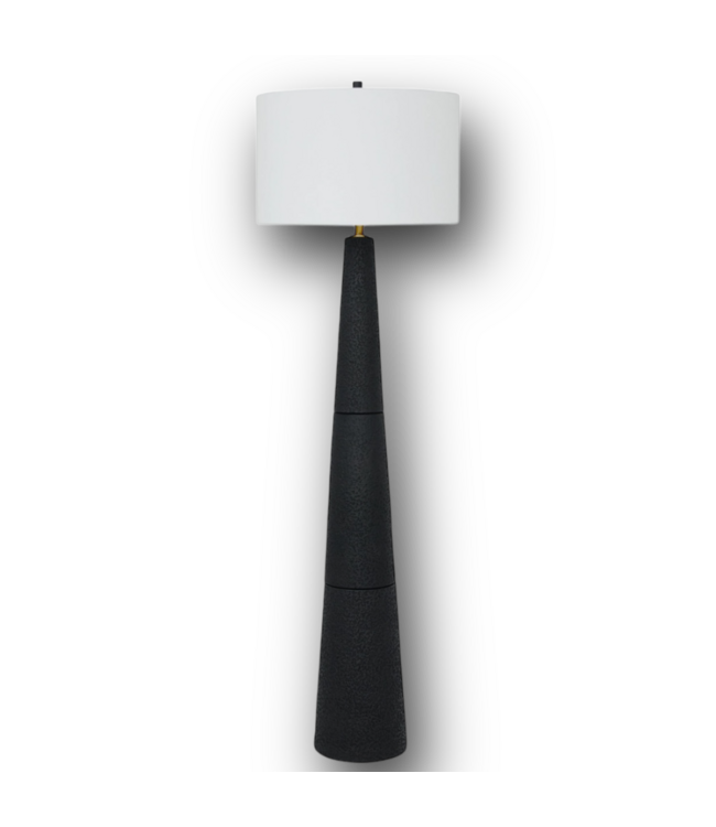 Good condition in box. Assembly required. Ashley Hallburg collection. Chic style. White fabric shade. Heavily textured black finish. 3-way switch. Plug-in type. Uses one E26 bulb, not included. Dimensions: 21.13"W x 21.13"D x 68.25"H. Cord length: 133.5".
