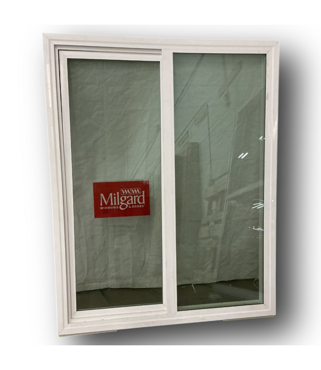 Good condition. Milgard. Low-E argon. White vinyl material. No screen. Lock system. Dimensions: 45.375"W x 57.375"H.
