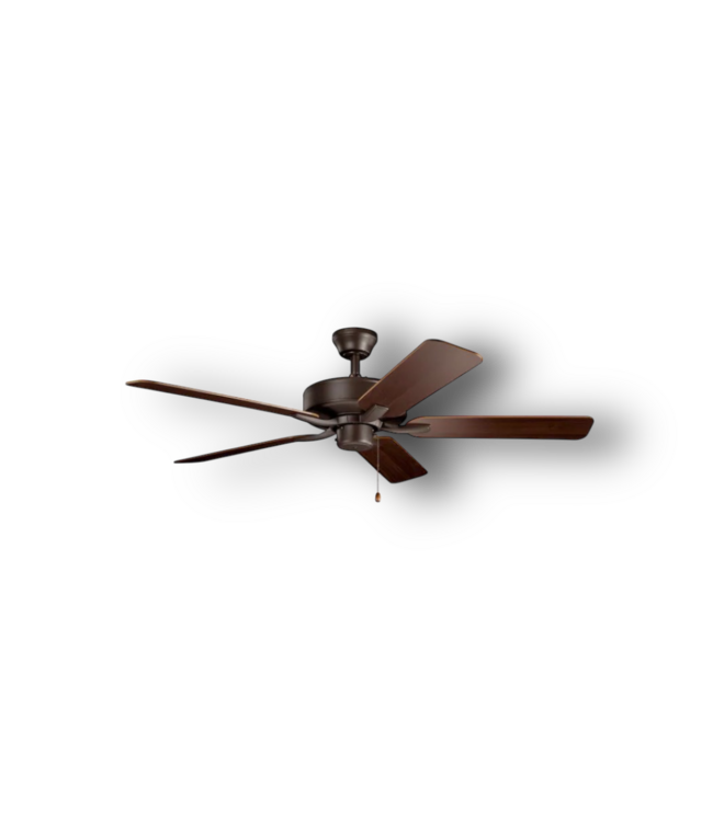 Good condition in box. Like new. Kichler Basics Pro Ceiling Fan 52-in W. Satin natural bronze indoor fan with five reversible Walnut/Cherry blades. Features a 3-speed motor and pull chain control. Light kit compatible. Size: 52-in W x 12.5-in H.