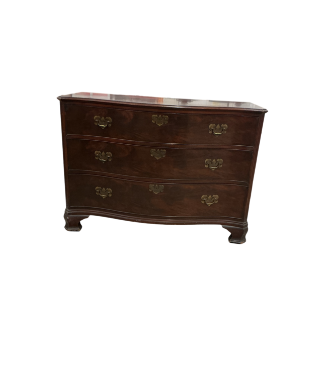 Good condition. Dark Oak 48"W Federal Style Dresser. Traditional brass drawer pulls gives it a nice vintage look. Three drawers. Elegant "S" curve shape. Bracket feet. Dimensions: 48"W x 21"D x 33.5"H.