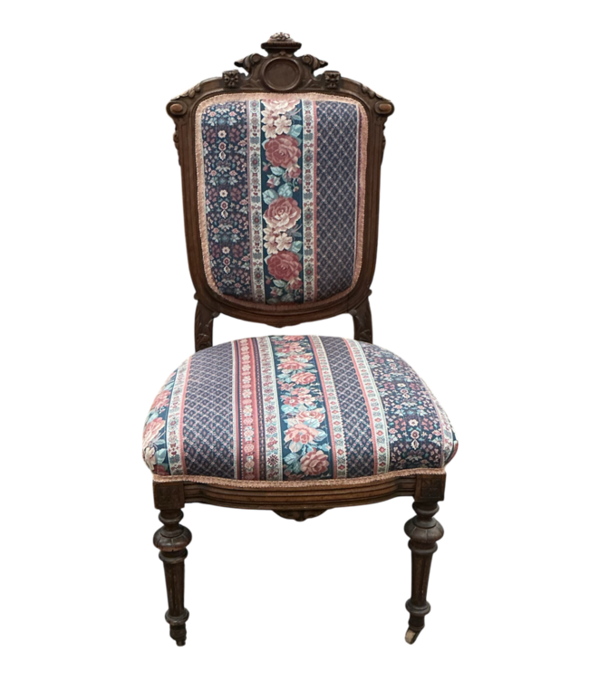 Good condition. Traditional Side Chair Set of Two. Ornate carved wooden details. Turned legs. Front legs mounted on small wheels. Floral upholstered pattern. Perfect to use a parlor or accent chairs. Dimensions: 19"W x 18"D x 40"H. Seat height: 17"H.