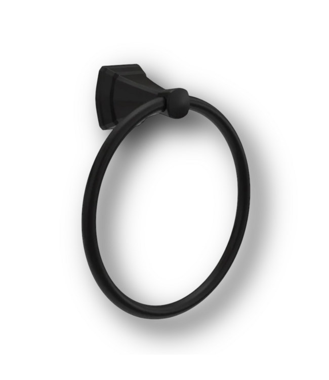 Good condition in box. Like new. Delta Flynn Matte Black Towel Ring. Features a modern design with squared edges and sloping angles. Crafted from durable zinc with a corrosion-resistant finish. Includes hardware. Size: 6.4"W x 2.6"D x 7.1"H.