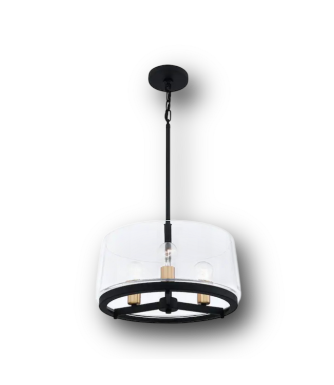 Good condition in box. Quoizel Whitlock collection. Steel construction. Matte black & Brushed weathered brass finish colors. Clear glass shade. Dimmable. Hardwired. Dimensions: 16"W x 24"H. Adjustable hanging height: 60" - 84". Read more.