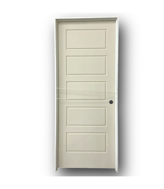 In good condition. Prehung 5 Panel Interior Door. Left hand inswing. 5 raised panels. Primed ready to paint. Hollow core. Without frame: 32"W x 1.375"T x 79.875"H. With frame: 33.5"W x 4.5"T x 81.5"H.