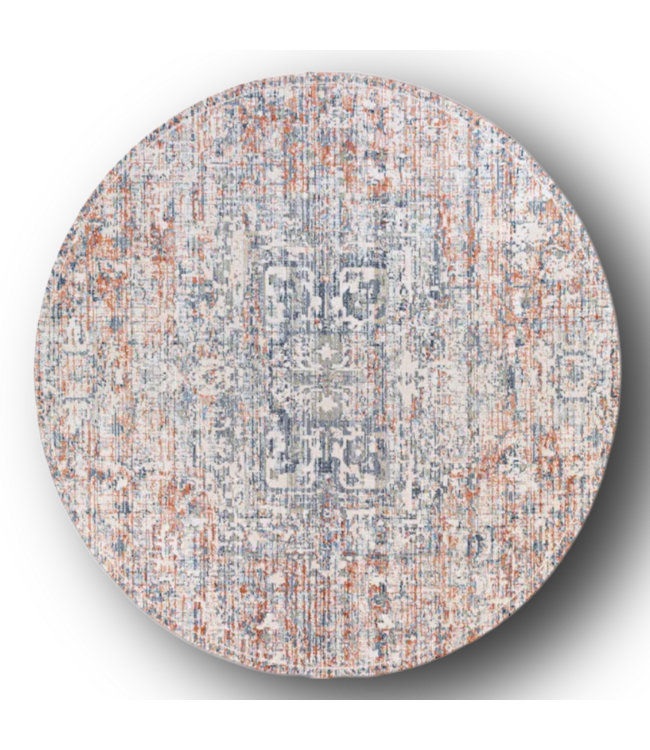 Good condition. Surya Round Indoor Flatweave Area Rug. Made with polyester. Oriental style with denim finish. Pet friendly. Spot clean only. Dimensions: 7.84'Diameter x 0.35"T.