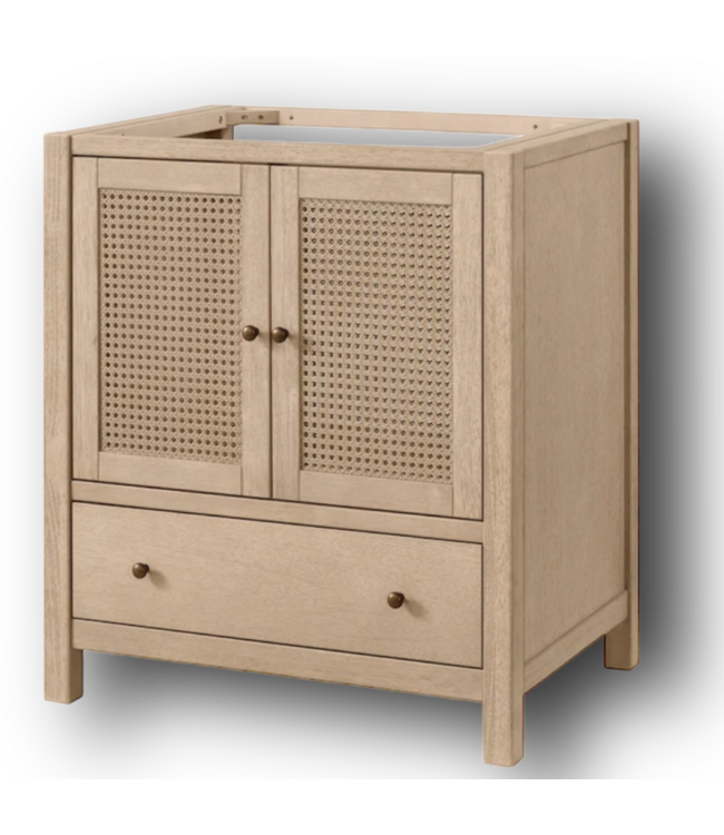 Good condition in box. Assembly required. Alaterre furniture Lucca collection. Vanity base only (no top). Inset cane detailing. Copper hardware included. Solid wood frame. Open back. 2-doors. 1-pullout drawer. Dimensions: 30"W x 21.5"D x 34"H.