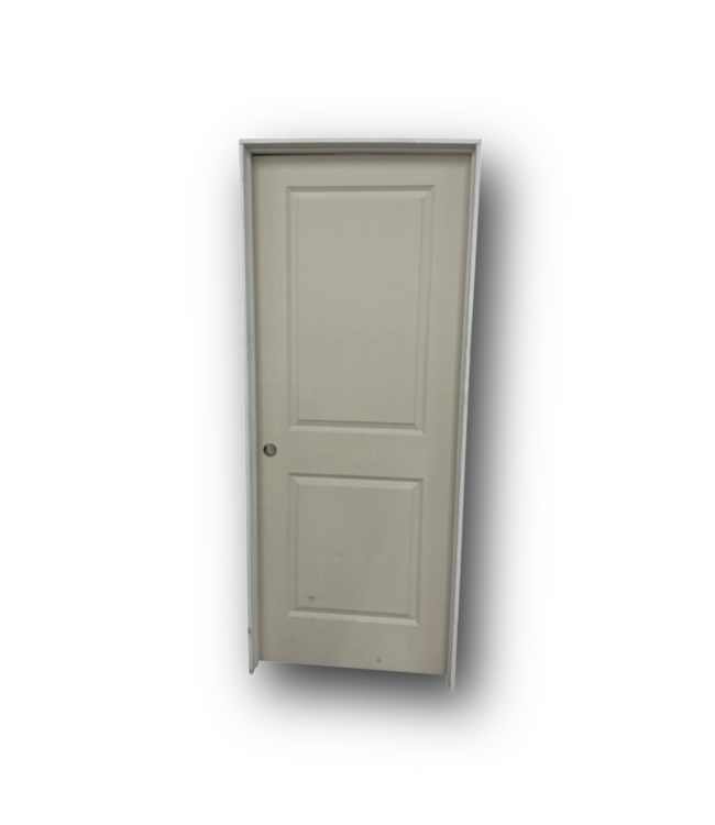 Good condition. Right hand inswing. Prehung, easy install. Primed ready to be painted. 2-raised panels. Hollow core. Dimensions: W/Frame: 33.375"W x 4.5"T x 81.75"H. W/O Frame: 31.875"W x 1.375"T x 80"H. Does have spots that can be painted over*see photos