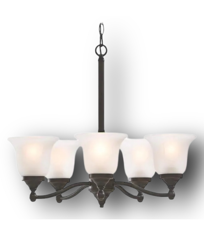 Good condition in box. Project Source 5-Light Bronze $ Frosted Glass Chandelier. Can be installed with lights facing up or down. Adjustable chain (48") to set to desired length. Hardwired. Dry rated. Bulbs not included. Dimensions: 22.97"W x 19.08"H.
