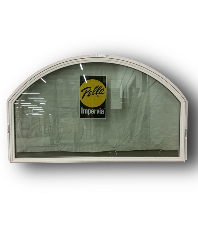 In good condition. Pella White Aluminum Arch Top Fixed Window. Fixed frame/ special shape. Annealed. Argon gas. Dimensions: 59.625"W x 21"H low point, 35.75"H high point.