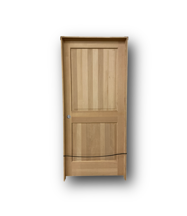 In good condition. Pine Prehung Interior Right Hand Door. Unfinished. Solid core. 2 raised panels. Right hand inswing. Single bore. Without frame: 35.875"W x 1.375"T x 80"H. With frame: 37.25"W x 4.5"T x 82"H.