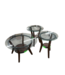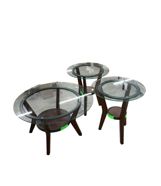 Good condition. Glass top. Open storage. Solid wood legs. Dark brown finish. Contemporary style. Wood grain frame finish. Gun metal band wraps around shelf. Dimensions: End Tables: 22"W x 22"D x 24"H. Cocktail Table: 34"W x 34"D x 18.625"H.