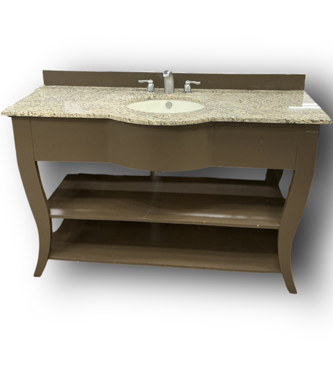Used in good condition. Wood & Quartz Bathroom Vanity. Tiger skin white quartz top. Oval undermount sink. Grayish brown wooden base with backsplash. Brushed chrome widespread faucet. Decorative legs, 2 fixed shelves, Dimensions: 58"W x 24"D x 36.25"H.