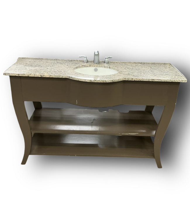 Used in good condition. Grayish Brown Bathroom Vanity With Top. Tiger skin white quartz top. Oval undermount sink. Grayish brown wooden base with backsplash. Brushed chrome widespread faucet. Dimensions: 58"W x 24"D x 36.25"H.