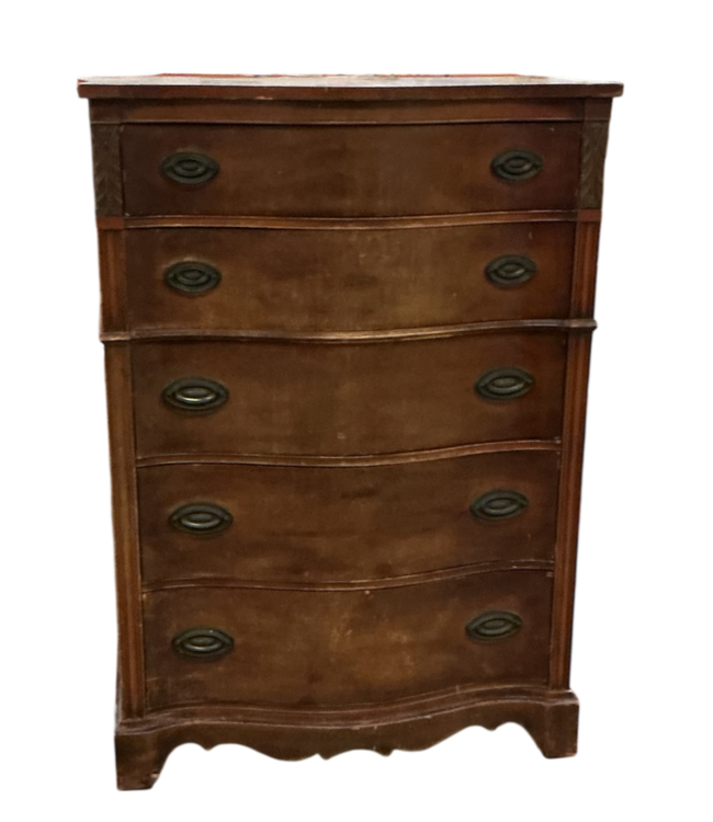 Pre-owned good condition. Vintage Mahogany Dresser 34"W. Five drawers. Brass drawer pulls. Solid construction. Decorative carved details. S-curve shape. Dimensions: 24"W x 20"D x 48.5"H.