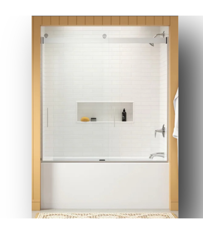 Good condition in box. Kohler Levity Frameless Bypass Sliding Bathtub Door. Bright silver. Alcove. Crystal clear. Reversible door. Hardware included Water repellent coating. Bar handle. Dimensions: 56" to 60"W x 1/4"T glass x 62"H.