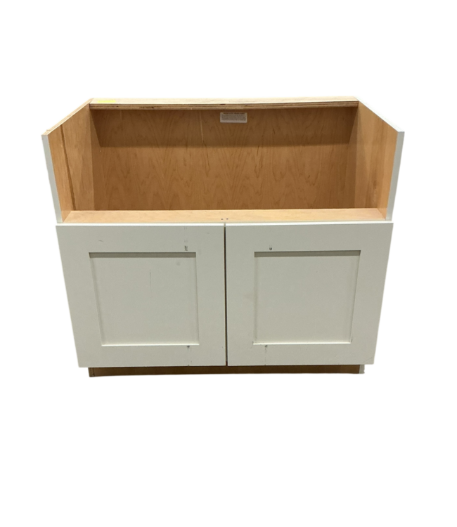 Good condition. White Apron Farm Sink Base 39"W. Shaker panel style doors. Soft close doors. 6-way adjustable hinges. Solid wood construction. Dimensions: 39"W x 24"D x 34.5"H.