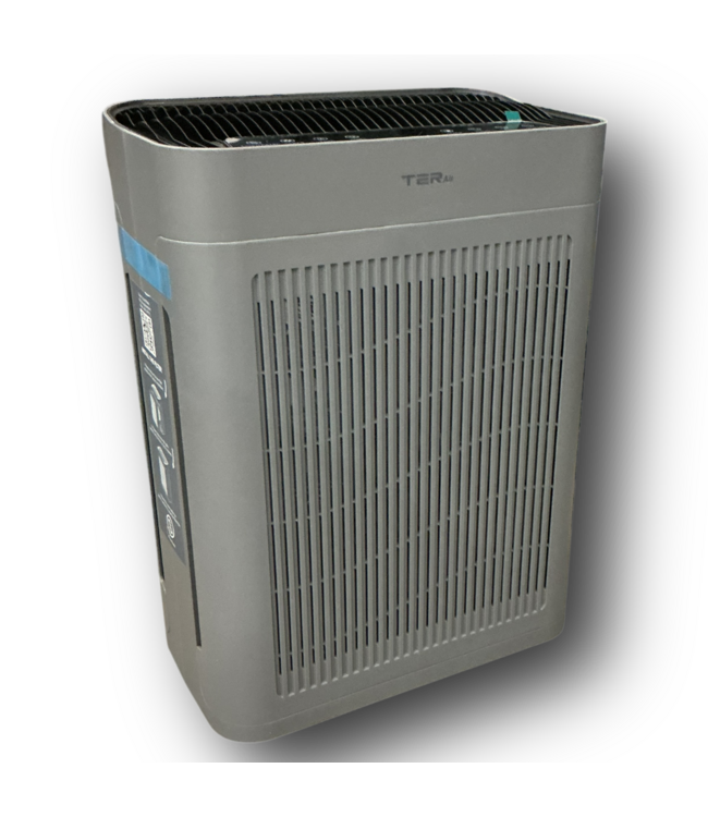 Good condition in box. TerAir Dual Sided HEPA Air Purifier. PM2.5 sensor and washable filters for pets. Pet and kid friendly. 4 adjustable fan speeds. Integrated aromatherapy pad for soothing essential oil scents. Dimensions: 12.75"W x 6.75'D x 15.75"H.