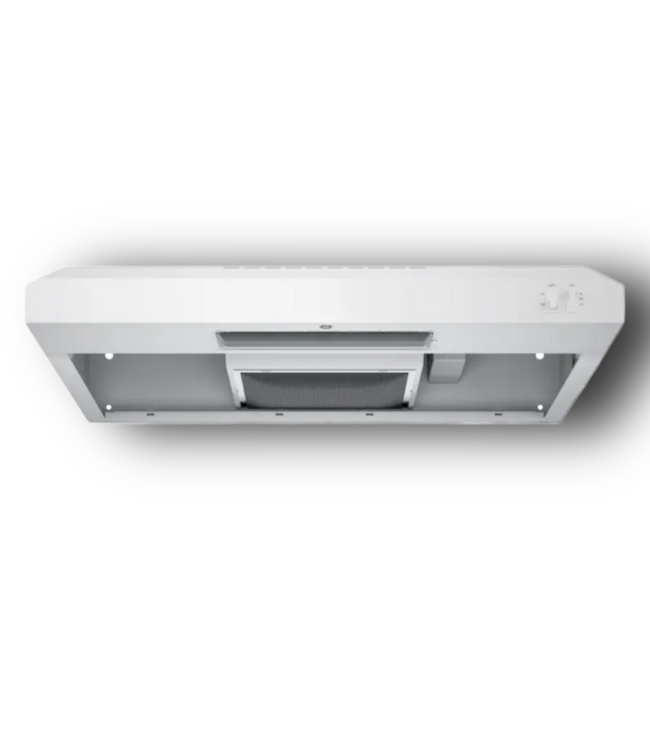 Good condition in box. GE Convertible White Under Cabinet Range Hood. Indoor. Charcoal filter. Rocker fan control. 200 CFM. 2.5 Amp. Back/top exhaust. 7" Damper included. 2 speeds. 120 volts.300 watt. Dimensions: 29.875"W x 20"D x 5.5"H.