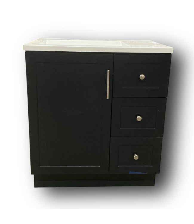 Good condition. Brushed nickel hardware included. Navy blue finish color. White integrated sink, offset to the left with 3 pre-drilled holes. Open back. 1-door. 3-pullout drawers. Toe kick. Dimensions: 30.5"W x 18.75"D x 35.25"H.
