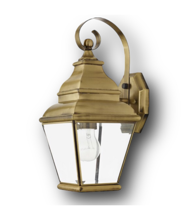 Good condition in box. Livex Lighting Exeter 1-Light Antique Brass Outdoor Wall Light. Hardwired. Incandescent. Beveled glass. Empired shape. Hardware included. Down direction. Wet rated. Dimensions: 6.5"W x 8"D x 15.5"H.