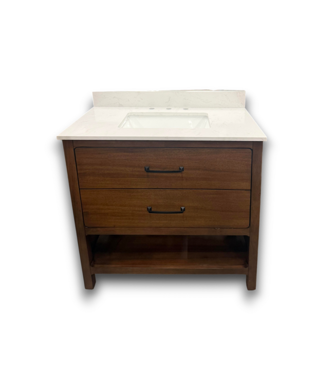 Priced over $1,100 elsewhere. Engineered stone top pre-drilled for 8-in widespread. Solid wood frame. 1-flip out drawer. 1-pullout drawer with dividers. 1-bottom shelf. Freestanding. Fully assembled. Warm walnut color. Backsplash included. Soft close. Dimensions: 36"W x 20"D x 34.5"H.
