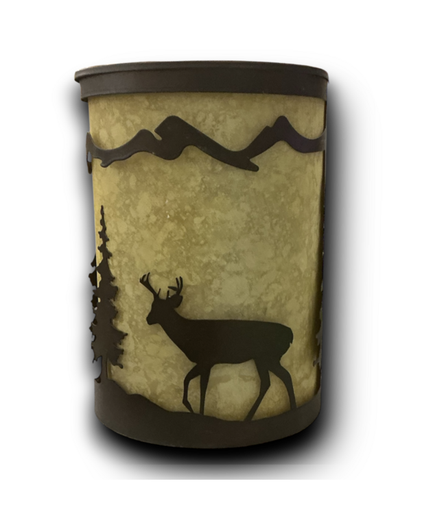 Priced at $191 elsewhere. Burnished bronze & silhouetted deer imagery over glowing amber flake glass shade. Uses 1-100W E26 bulb or LED equivalant (not included). Dimmable. Indoor/outdoor, wet rated. ETL & C ETL safety listed. Dimensions: 8"W x 5"D x 11"H.