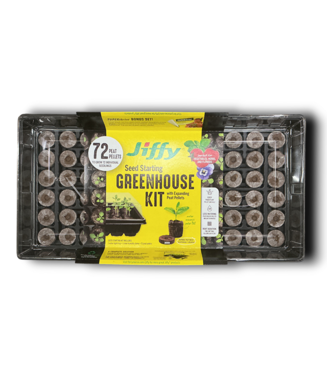 Good condition in box. Jiffy Seed Starting Greenhouse Kit 72 Peat Pellets. Ideal for vegetables, herbs & flowers. Easy transplant, peat and all. Peat holds 20x its weight in water. 1 watertight tray, 1 clear humidity dome & 72 (36mm) peat pellets.