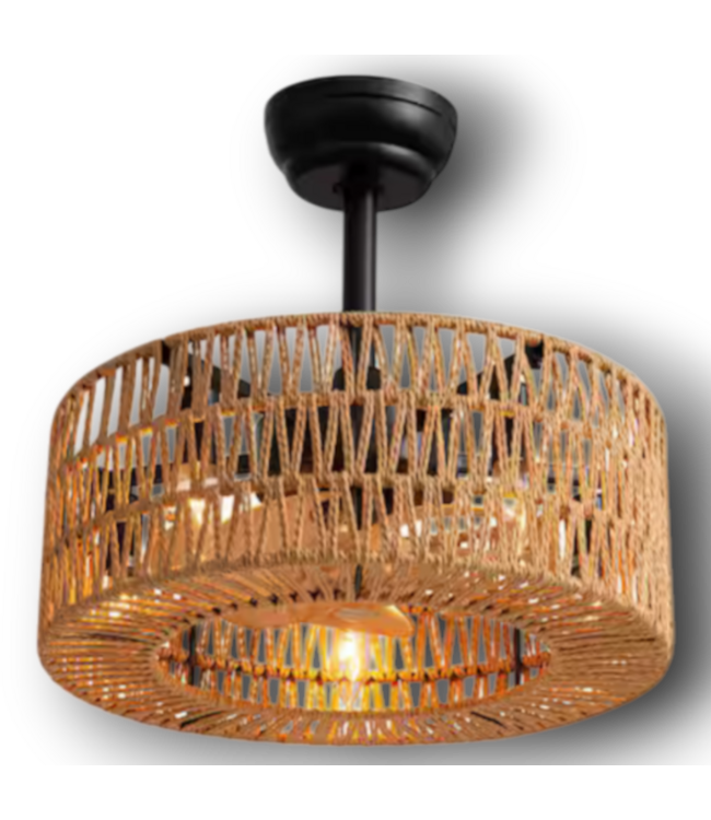 Good condition in box. Pacific Core Boho Farmhouse Indoor Ceiling Fan With Remote. Brown rattan. Caged. Abaca twine. 7 blades. 1580 CFM. 5 lights. 6 speeds. For rooms up to 250 sq. ft. Downrod. Dimensions: 17.7"W x 13.4"H.