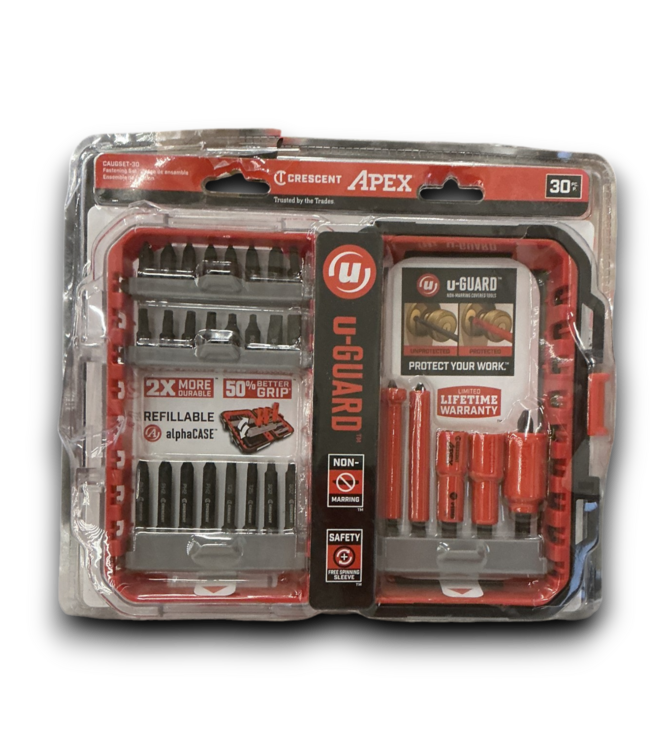 Good condition in package. Crescent Apex u-Guard 30-Piece Impact Driver Bit Set. Priced at $24 elsewhere. Non-marring cover protects from damages. Free spinning design enhances control & safety. Optimized tip geometry for best fit.