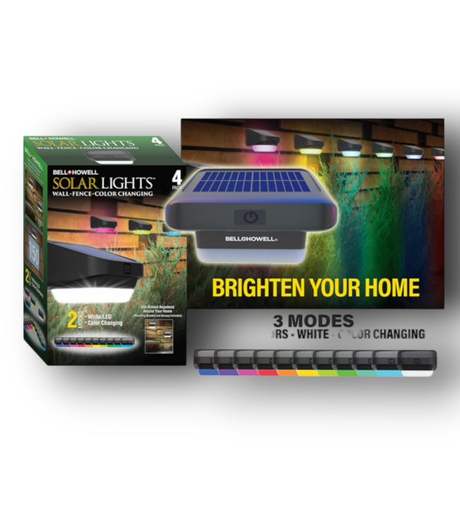 Good condition in box. Bell+Howell solar lights for fence, deck, pathway or porch. LED color glow. Waterproof. 10-color changing light modes. Black finish color. Mounting screws included. Dimensions: 3"W x 3.5"D x 2.5"H.