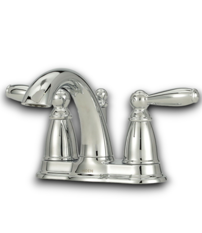 Good condition in box. Moen Brantford collection. 4-in centerset. Polished chrome finish color. Traditional style. 2-handle levers. Low arc. Deck mount type. 1.2 GPM. Drain included. Dimensions: Spout height: 5". Spout reach: 5.06".