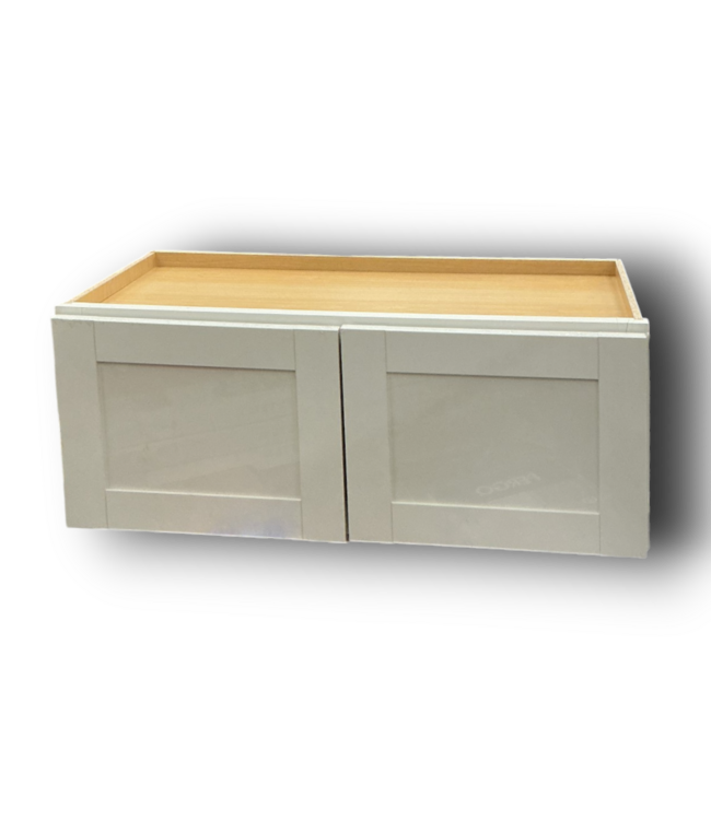 Good condition. White color. Recessed shaker panel style. 2-doors. No shelves. Dimensions: 30"W x 12"D x 12"H. Doesw have small crack*see photo.