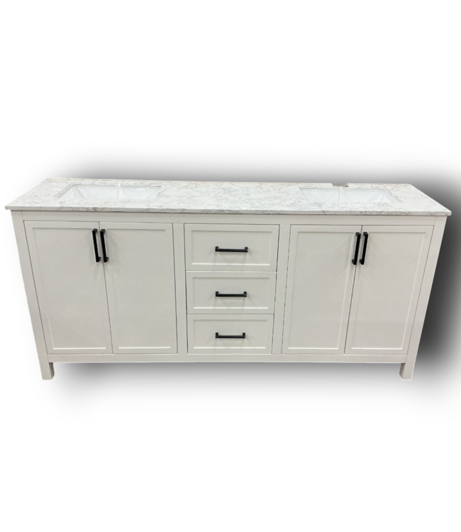 In good condition, unboxed in store, fully assembled. Allen + Roth Lenoir White Double Sink Bathroom Vanity With Top. Freestanding. Pine wood. 6 adjustable height legs. Soft close. 3 drawers, 4 doors, 2 shelves. Dimensions: 72"W x 22"D x 34.49" to 35.5"H.
