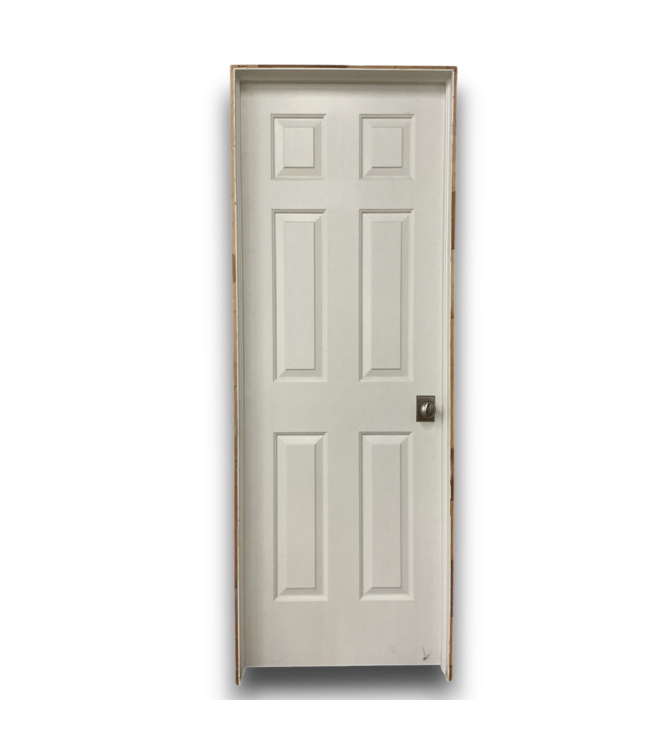 Lightly used in good condition. Left Hand Prehung Interior Door.6 raised panels. Left hand inswing. Nickel handle included. Painted white. Without frame: 27.875"W x 1.375"T x 80"H. With frame: 29.375"W x 4.5"T x 81.5"H.