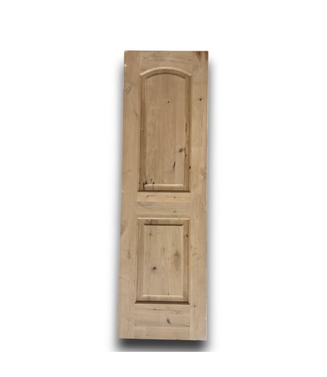 Good condition. Like new. Knotty alder. Solid core. Unfinished. 2-raised panels, one arched top. No bore. Slab door. Thicker door, for sound-dampening. Dimensions: 24"W x 1.75"T x 80"H.