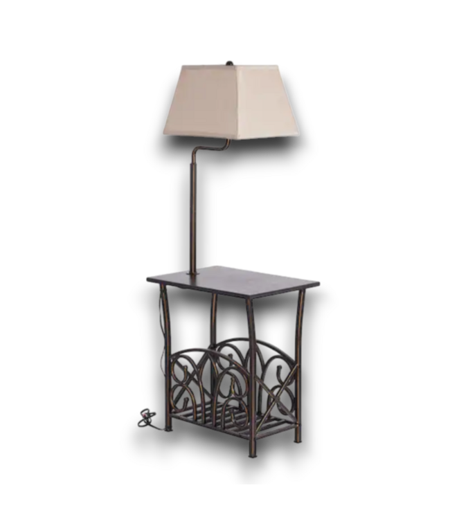 Good condition. Allen+Roth. Bronze finish color. Beautiful lamp with built-in wood table & magazine rack. 3-way switch. Plug in. Beige fabric shade. Dimensions: 15"W x 20"D x 54"H.