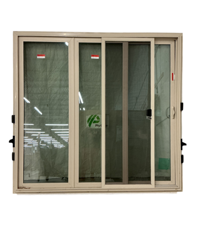 Good condition. Polygem 3-panel sliding patio door. Sand color. Two panels are fixed, and the right panel slides open (when viewed from outside the home). Screen included. Dimensions: 83.5"W x 79.5"H. Does have scratches on the handle*see photos.