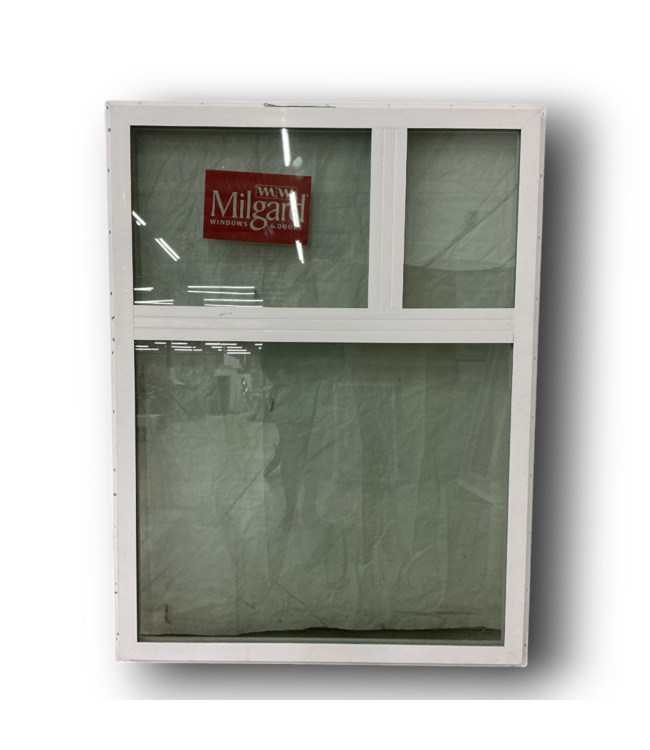 In good condition, Milgard Vinyl 3-Panel Fixed Window. White vinyl frame. 3 fixed panels. Double pane. Low-E tempered clear glass. Dimension: 47.625"W x 63.5"H.